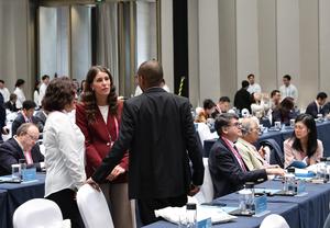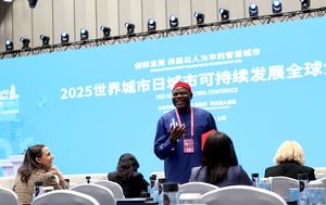 (251026) -- SHANGHAI, 26 octubre, 2025 (Xinhua) -- Invitados se comunican en la sede de la Conferencia Mundial de Ciudades...