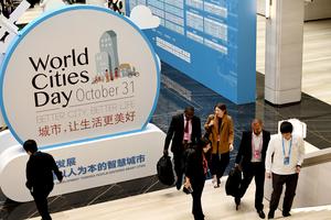 (251026) -- SHANGHAI, 26 octubre, 2025 (Xinhua) -- Invitados caminan en la sede de la Conferencia Mundial de Ciudades SDG...