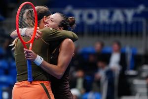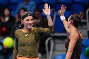 (251026) -- TOKIO, 26 octubre, 2025 (Xinhua) -- Timea Babos (Hungría)/Luisa Stefani (d-Brasil) festejan la victoria después de ganar el...