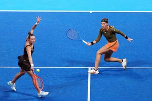 (251026) -- TOKIO, 26 octubre, 2025 (Xinhua) -- Timea Babos (Hungría)/Luisa Stefani (i, Brasil) compiten durante el partido final de...