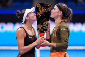 (251026) -- TOKIO, 26 octubre, 2025 (Xinhua) -- Timea Babos (d, Hungría)/Luisa Stefani (Brasil) festejan durante la ceremonia de premiación...
