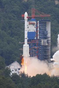 (251026) -- XICHANG, 26 octubre, 2025 (Xinhua) -- Un cohete portador Gran Marcha-3B transportando al satélite Gaofen-14 02 despega del...
