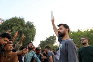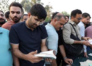 (251026) -- BAGDAD, 26 octubre, 2025 (Xinhua) -- Imagen del 25 de octubre de 2025 de personas intentando conseguir libros...
