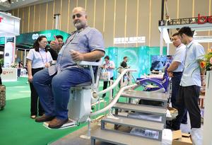 (251031) -- GUANGZHOU, 31 octubre, 2025 (Xinhua) -- Un visitante prueba una silla salvaescaleras en el área de exposición de Atención Médica Inteligente de la edición 138 de la Feria de Cantón, en Guangzhou, en la provincia de Guangdong, en el sur de China, el 31 de octubre de 2025. La tercera fase de la edición 138 de la Feria de Cantón comenzó aquí el viernes, con un área de exposición de Atención Médica Inteligente que destaca tecnologías médicas de vanguardia como robots médicos, diagnóstico inteligente y sistemas de monitorización de la salud. (Xinhua/Lu Hanxin) (jg) (da) (ce)
