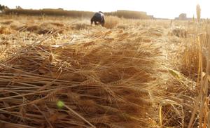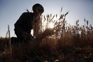 (251101) -- SANA, 1 noviembre, 2025 (Xinhua) -- Imagen del 31 de octubre de 2025 de un agricultor cosechando trigo...