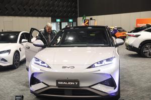 (251101) -- CHRISTCHURCH, 1 noviembre, 2025 (Xinhua) -- Personas observan un vehículo chino BYD en la Take Charge Expo, en...
