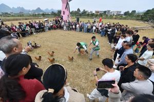 (251101) -- GUANGXI, 1 noviembre, 2025 (Xinhua) -- Personas participan en un concurso de captura de pollos y patos durante...