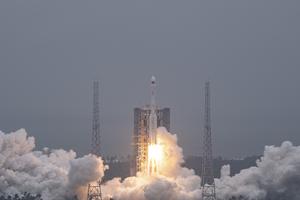 (251103) -- WENCHANG, 3 noviembre, 2025 (Xinhua) -- Un cohete portador modificado Gran Marcha-7 transportando al satélite Yaogan-46 despega del...