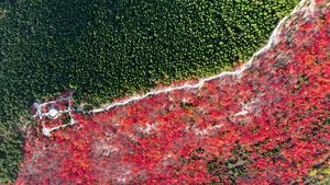(251103) -- JINAN, 3 noviembre, 2025 (Xinhua) -- Vista aérea tomada con un dron del paisaje otoñal de la montaña...