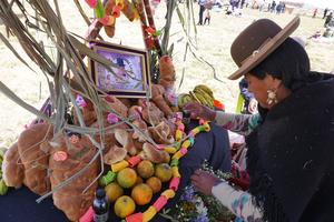 (251102) -- EL ALTO, 2 noviembre, 2025 (Xinhua) -- Una mujer indígena coloca una ofrenda en la tumba de su...