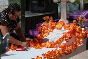 (251102) -- SAN SALVADOR, 2 noviembre, 2025 (Xinhua) -- Una mujer adorna una tumba con flores durante la conmemoración del...