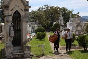 (251102) -- SAN SALVADOR, 2 noviembre, 2025 (Xinhua) -- Músicos cargan instrumentos mientras caminan entre las tumbas durante la conmemoración...