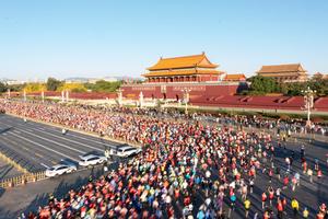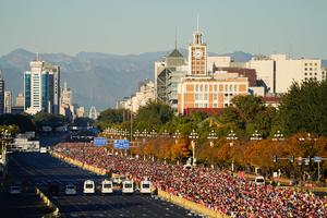 (251102) -- BEIJING, 2 noviembre, 2025 (Xinhua) -- Participantes corren junto a la plaza de Tian'anmen durante el Maratón de...