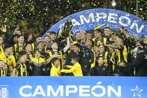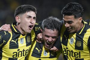 (251103) -- MONTEVIDEO, 3 noviembre, 2025 (Xinhua) -- Imagen del 2 de noviembre de 2025 de jugadores de Peñarol festejando...