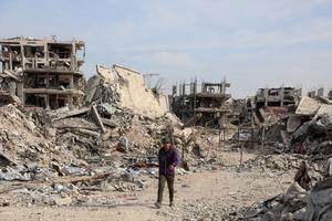 (251103) -- GAZA, 3 noviembre, 2025 (Xinhua) -- Imagen del 2 de noviembre de 2025 de un palestino caminando por...