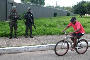 (251103) -- BELEM, 3 noviembre, 2025 (Xinhua) -- Soldados de la Fuerza Aérea patrullan una calle durante una operación de Garantía de Ley y del Orden previo al inicio de la 30ª Conferencia de las Partes (COP30) de la Convención Marco de las Naciones Unidas sobre el Cambio Climático, en Belém, estado de Pará, Brasil, el 3 de noviembre de 2025. El presidente de Brasil, Luiz Inácio Lula da Silva, firmó un decreto, publicado el lunes en el Diario Oficial de la Unión, que autoriza la movilización de las Fuerzas Armadas en operaciones de Garantía de la Ley y del Orden en la ciudad de Belém do Pará hasta el 23 de noviembre próximo. (Xinhua/Lucio Tavora) (lt) (rtg) (ah) (ce)