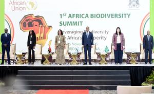 (251105) -- GABORONE, 5 noviembre, 2025 (Xinhua) -- El presidente de Botsuana, Duma Boko (3-d), y la vicepresidenta de la Comisión de la Unión Africana (UA), Selma Malika Haddadi (2-d), participan en la primera Cumbre de la Biodiversidad de Africa, en Gaborone, Botsuana, el 5 de noviembre de 2025. Boko anunció el miércoles el apoyo de su país al Fondo Africano para la Biodiversidad e instó a los países africanos a reestructurar sus economías en torno al valor de la naturaleza para para hacer frente a la grave escasez de fondos destinados a la conservación. (Xinhua/Tshekiso Tebalo) (jg) (da) (ce)