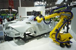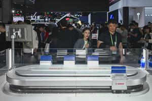 (251106) -- SHANGHAI, 6 noviembre, 2025 (Xinhua) -- Visitantes observan LeTrak, un sistema de transporte por accionamiento magnético de Bosch,...