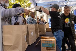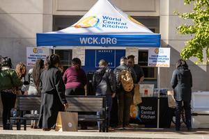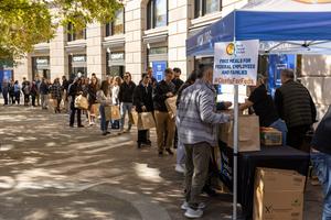 (251106) -- WASHINGTON, 6 noviembre, 2025 (Xinhua) -- Imagen del 5 de noviembre de 2025 de trabajadores federales recibiendo alimentos...