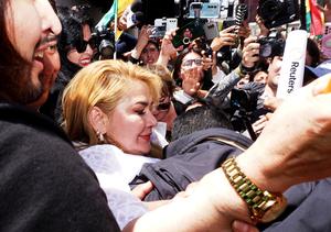 (251106) -- LA PAZ, 6 noviembre, 2025 (Xinhua) -- La expresidenta interina boliviana, Jeanine Añez (d), saluda a sus simpatizantes...