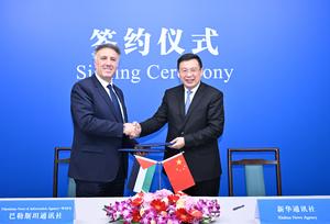 (251107) -- BEIJING, 7 noviembre, 2025 (Xinhua) -- Fu Hua, presidente de la Agencia de Noticias Xinhua, y Ahmed Assaf, supervisor general de Medios de Comunicación Oficiales Palestinos y presidente de la junta directiva de la Agencia Palestina de Noticias e Información (WAFA), asisten a la ceremonia de firma de un memorando de entendimiento sobre cooperación, en Beijing, capital de China, el 7 de noviembre de 2025. La Agencia de Noticias Xinhua y la WAFA firmaron el viernes en Beijing un memorando de entendimiento sobre cooperación, acordando ampliar la colaboración en áreas como la capacitación de periodistas y la cobertura conjunta. (Xinhua/Li Xiang) (jg) (rtg) (ce)