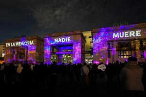 (251107) -- BOGOTA, 7 noviembre, 2025 (Xinhua) -- Imagen del 6 de noviembre de 2025 de personas observando la proyección de un video sobre la fachada del Palacio de Justicia durante la conmemoración por los 40 años de la toma del Palacio de Justicia ocurrida en 1985, en Bogotá, Colombia. Los colombianos conmemoraron el 6 de noviembre con diferentes actos simbólicos los 40 años de uno de los episodios más oscuros de la historia reciente del país, la toma en 1985 del Palacio de Justicia en Bogotá por un comando de la entonces guerrilla Movimiento 19 de Abril (M-19) con saldo de un centenar de personas fallecidas. (Xinhua/Andrés Moreno) (am) (jg) (rtg) (da)