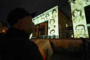 (251107) -- BOGOTA, 7 noviembre, 2025 (Xinhua) -- Imagen del 6 de noviembre de 2025 de un hombre observando la proyección de un video sobre la fachada del Palacio de Justicia durante la conmemoración por los 40 años de la toma del Palacio de Justicia ocurrida en 1985, en Bogotá, Colombia. Los colombianos conmemoraron el 6 de noviembre con diferentes actos simbólicos los 40 años de uno de los episodios más oscuros de la historia reciente del país, la toma en 1985 del Palacio de Justicia en Bogotá por un comando de la entonces guerrilla Movimiento 19 de Abril (M-19) con saldo de un centenar de personas fallecidas. (Xinhua/Andrés Moreno) (am) (jg) (rtg) (da)