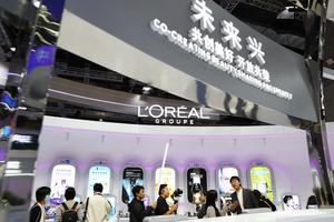 (251107) -- SHANGHAI, 7 noviembre, 2025 (Xinhua) -- Personas visitan el estand de L'Oreal, un participante desde hace ocho años...