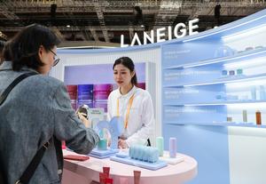(251107) -- SHANGHAI, 7 noviembre, 2025 (Xinhua) -- Una trabajadora presenta los productos de Laneige, una marca de Amorepacific Corporation,...