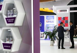 (251107) -- SHANGHAI, 7 noviembre, 2025 (Xinhua) -- Visitantes caminan por el estand de Kao Corporation, un participante desde hace...