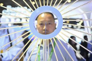 (251107) -- SHANGHAI, 7 noviembre, 2025 (Xinhua) -- Un hombre observa una pieza expuesta en el estand de Medtronic, un...
