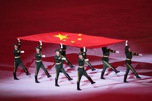 (251109) -- GUANGZHOU, 9 noviembre, 2025 (Xinhua) -- La bandera nacional de China es trasladada durante la ceremonia de inauguración...