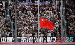 (251109) -- GUANGZHOU, 9 noviembre, 2025 (Xinhua) -- La bandera nacional de China es izada durante la ceremonia de inauguración...