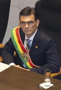 (251108) -- LA PAZ, 8 noviembre, 2025 (Xinhua) -- El presidente boliviano, Rodrigo Paz, reacciona durante su ceremonia de juramentación...