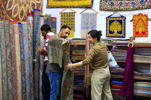 (251108) -- SHANGHAI, 8 noviembre, 2025 (Xinhua) -- Una visitante (d) aprende sobre los productos en un estand de alfombras...