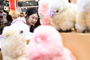 (251108) -- SHANGHAI, 8 noviembre, 2025 (Xinhua) -- Una visitante observa productos de lana de alpaca de Perú en el...