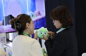 (251109) -- SHANGHAI, 9 noviembre, 2025 (Xinhua) -- Una empleada (d), presenta un robot de sanación emocional con inteligencia artificial...