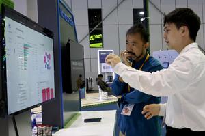 (251109) -- SHANGHAI, 9 noviembre, 2025 (Xinhua) -- Un empleado (d), presenta soluciones digitales con inteligencia artificial aplicadas en industrias...