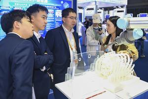 (251109) -- SHANGHAI, 9 noviembre, 2025 (Xinhua) -- Una expositora (d), presenta un robot quirúrgico inteligente en la Sección Especial...