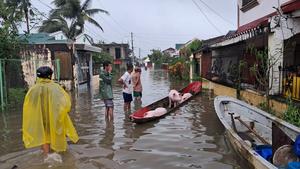 (251109) -- PROVINCIA DE CATANDUANES, 9 noviembre, 2025 (Xinhua) -- Casas son sumergidas en aguas de inundación debido al tifón...