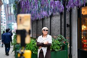 (251109) -- SHANGHAI, 9 noviembre, 2025 (Xinhua) -- Una visitante posa para fotografías en un distrito emblemático de la moda,...