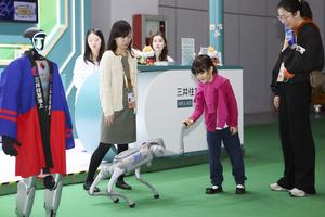 (251109) -- SHANGHAI, 9 noviembre, 2025 (Xinhua) -- Una niña interactúa con un perro robótico en el área de Exposición...