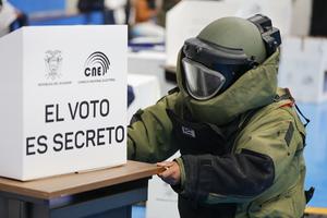 (251109) -- QUITO, 9 noviembre, 2025 (Xinhua) -- Un técnico de la Unidad de Desactivación de Explosivos ejecuta un procedimiento...