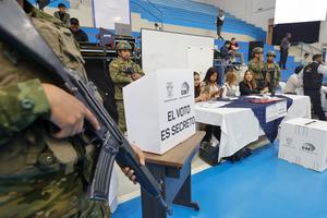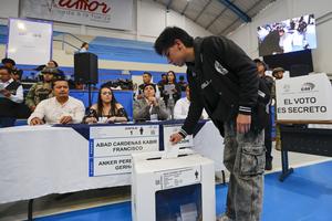 (251109) -- QUITO, 9 noviembre, 2025 (Xinhua) -- Un participante deposita una papeleta en la urna durante el Simulacro Nacional...