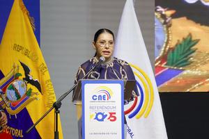 (251109) -- QUITO, 9 noviembre, 2025 (Xinhua) -- La presidenta del Consejo Nacional Electoral (CNE), Diana Atamaint, habla durante el...