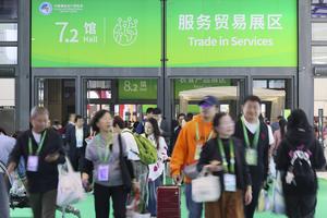 (251109) -- SHANGHAI, 9 noviembre, 2025 (Xinhua) -- Vista del área de Exposición de Comercio de Servicios durante la VIII...