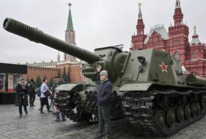 (251107) -- MOSCU, 7 noviembre, 2025 (Xinhua) -- Personas visitan una exposición al aire libre para conmemorar el desfile militar...