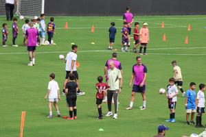 (251107) -- SAN SALVADOR, 7 noviembre , 2025 (Xinhua) -- El jugador, Carles Puyol (4-i), participa en una clínica deportiva...