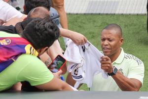 (251107) -- SAN SALVADOR, 7 noviembre , 2025 (Xinhua) -- El jugador, Julio Baptista (d), firma autógrafos durante un entrenamiento...