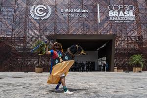 (251107) -- BELEM, 7 noviembre, 2025 (Xinhua) -- Imagen del 6 de noviembre de 2025 de un artista portando un...